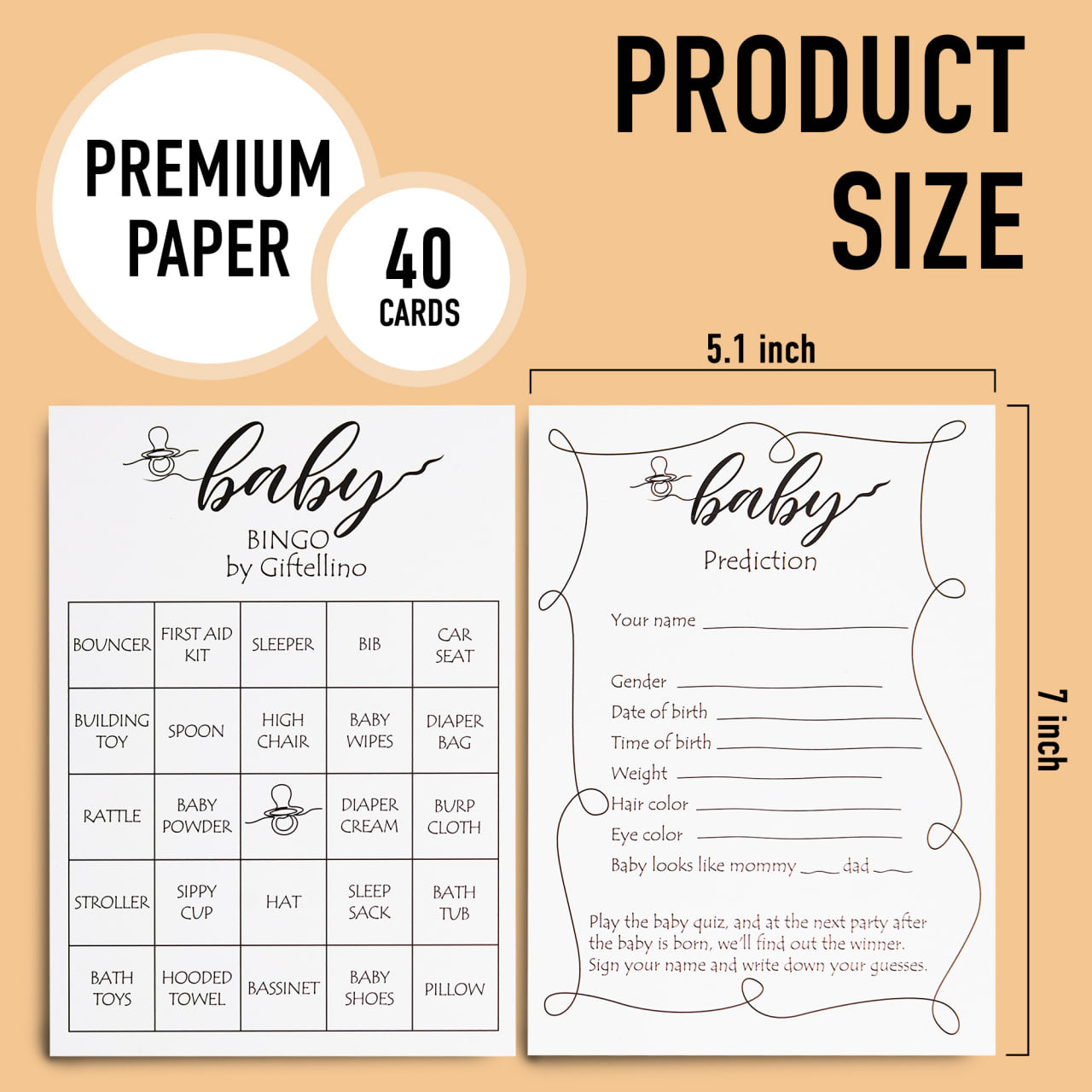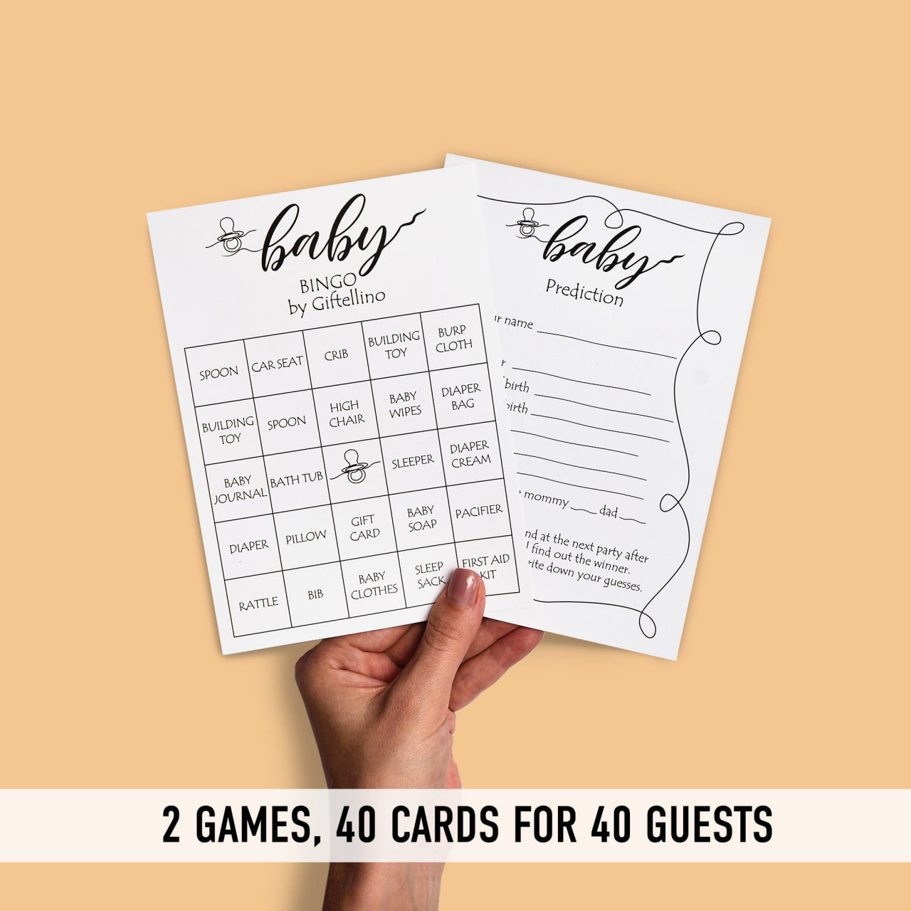 - 40 CARDS FOR 40 GUESTS: With 40 prediction and bingo cards, this set ensures everyone at your baby shower can join in on the fun!