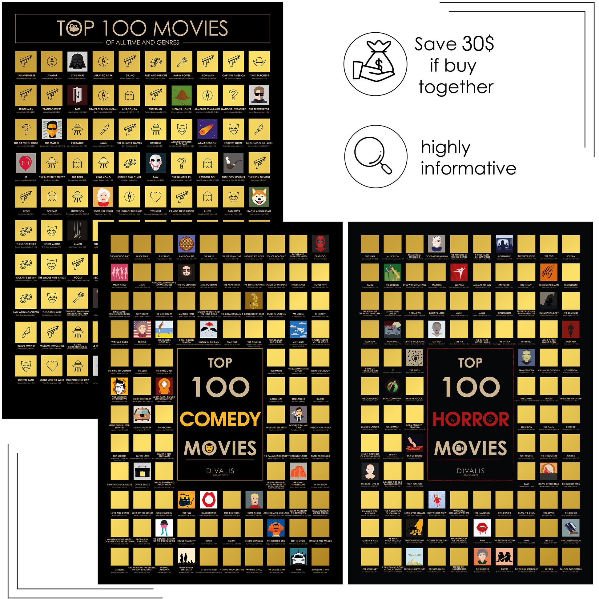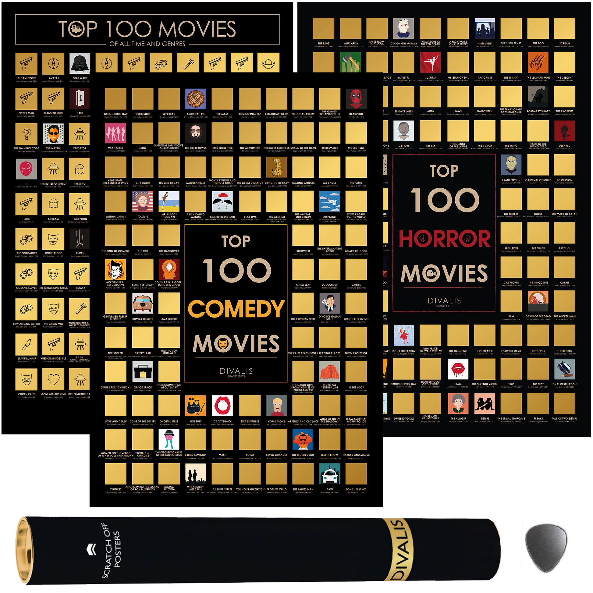 3 in 1 Gift Set Scratch off Posters of Horror Movies Comedies and Kids Movies - Scratchable Poster Bucketlist - Top 300 Films Checklist