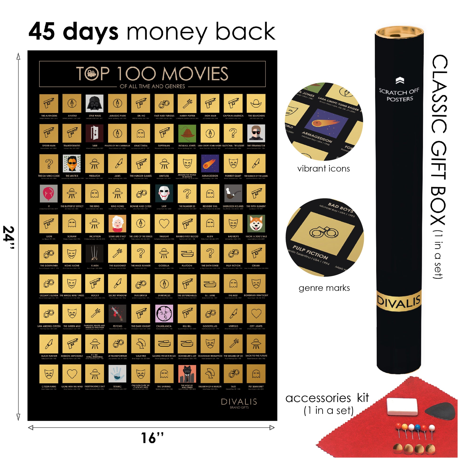 All combined with a 45-day manufacturer's warranty makes the 3-in-1 gift set a reasonable choice. Click "Add to cart” and get your scratch off posters of the horrors, comedies and movies soon!