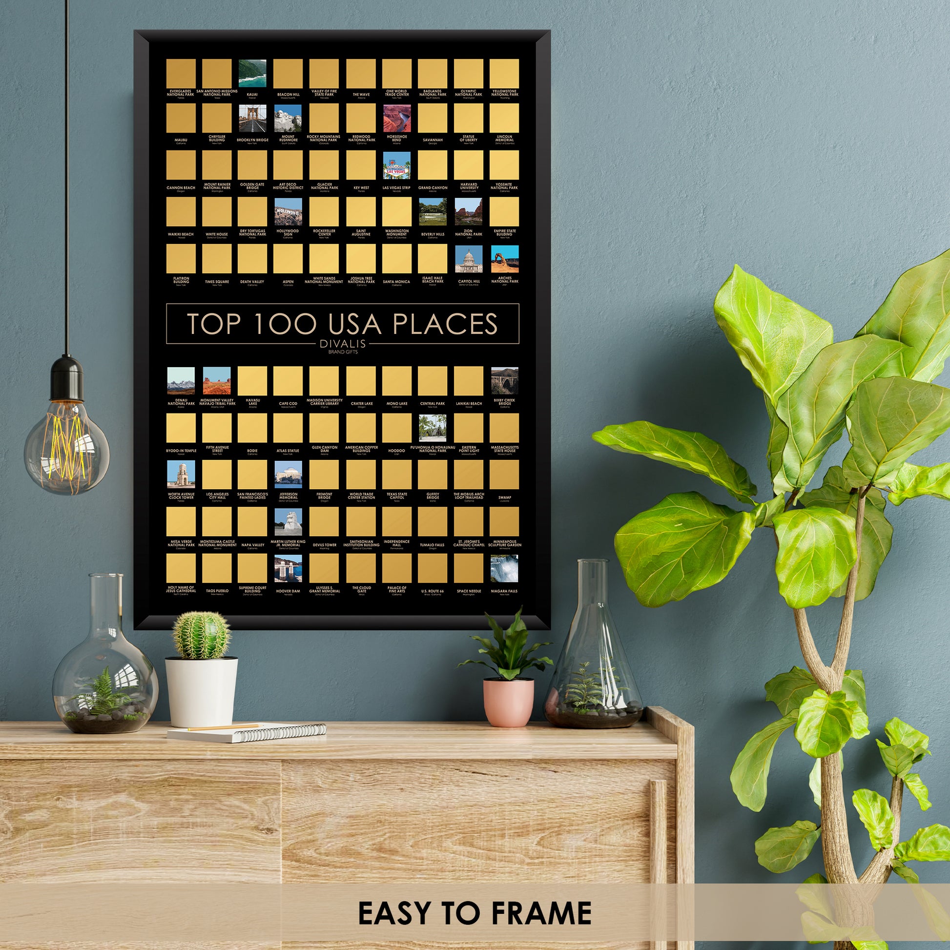 EASY TO ATTACH TO THE WALL - buy a 16-by-24-inch poster frame or use the special buttons from the set. Any doubts left? Don't forget about the manufacturer's 45-day warranty. Click "Add to cart" button and get your top 100 us destinations scratch off poster soon!